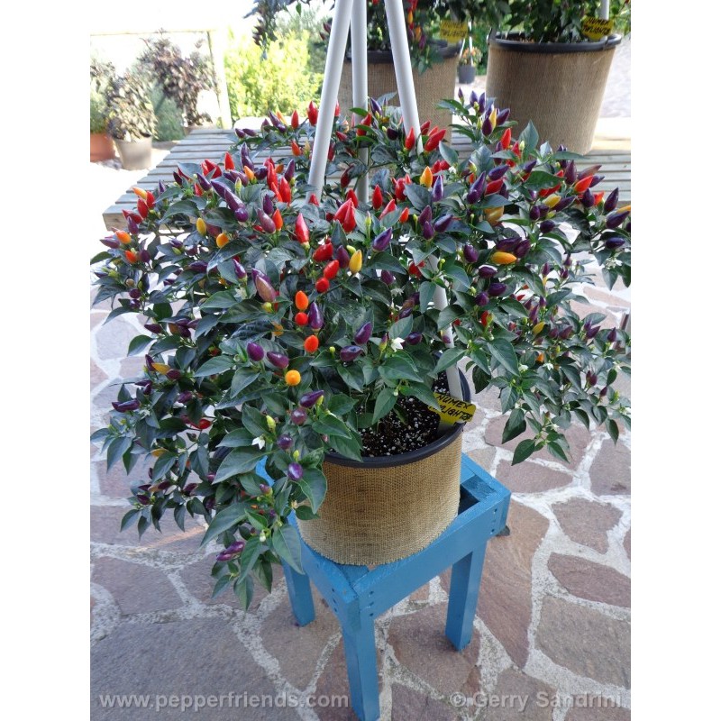 Cabe pelangi atau cabe rainbow yang menarik, pedas menengah, dengan buah tumbuh menghadap ke atas dan warna-warni karena tidak matang serempak. Ideal untuk tumbuh dalam pot di teras atau rumah kaca. Sumber vitamin C, antioksidan dan serat yang sangat baik.